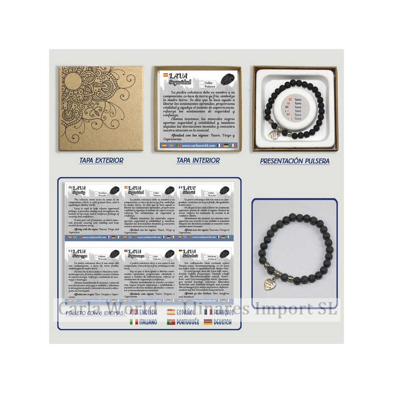 Presented in a kraft-style box, with a mineral properties brochure in 6 languages. Spanish, English, French, Portuguese, Italian and German.