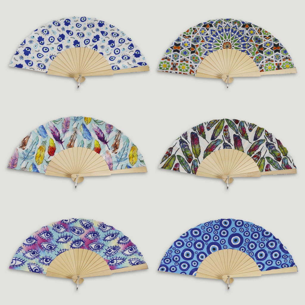 Wooden fan. 48. Model Evil Eye/Feathers/Various. Surtidos