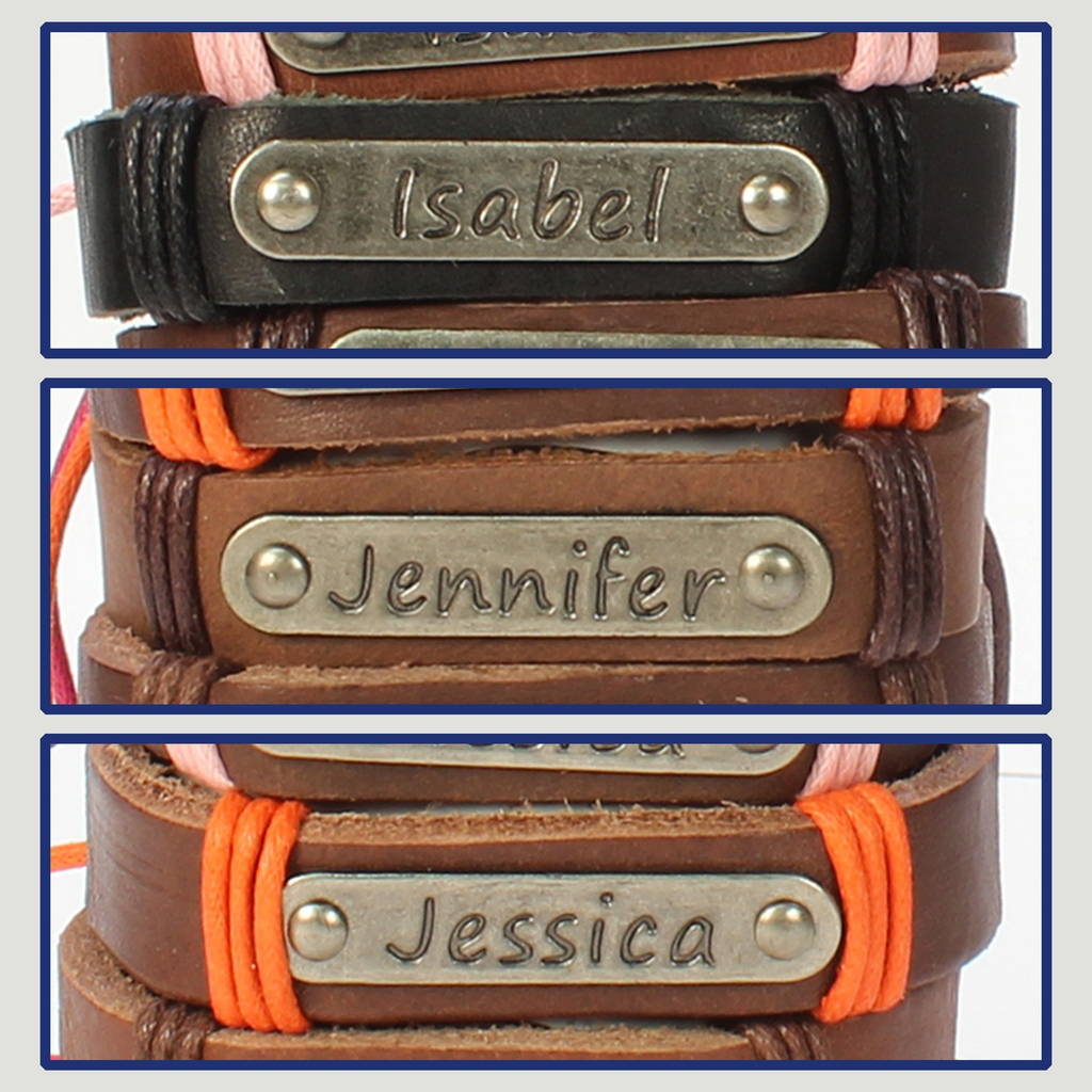 Gancho 29 – Pulsera piel con nombre. Letras I,J: Isabel, Jennifer y Jéssica