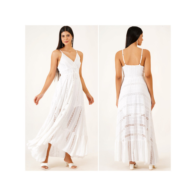 Style: Long dress with straps, straight back, and crossover V-neckline. Openwork and floral embroidery.