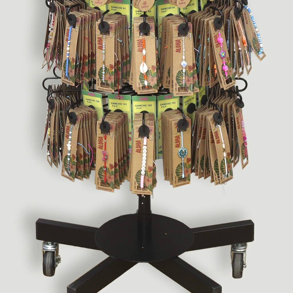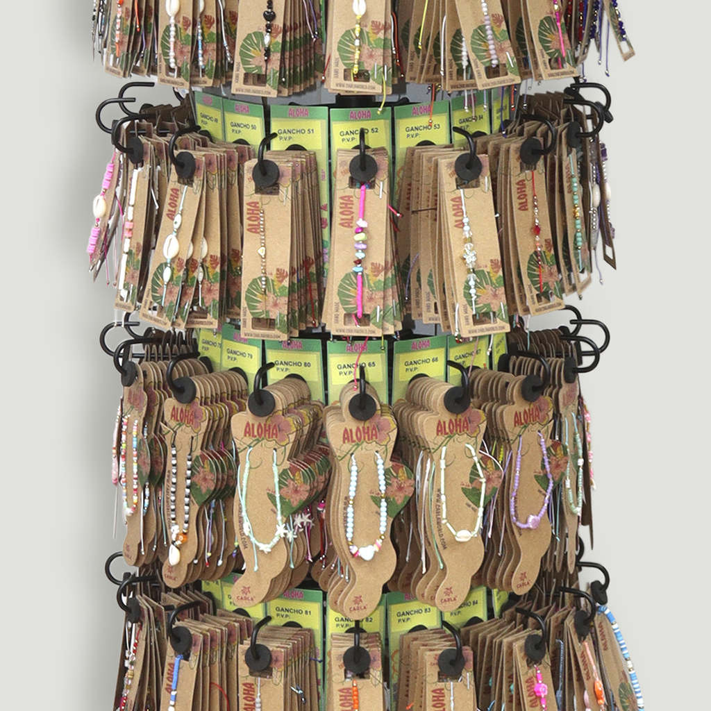 Se envían 192 collares/colgantes, 384 tobilleras y 768 pulseras, en total 1344 piezas montadas en expositor metálico.