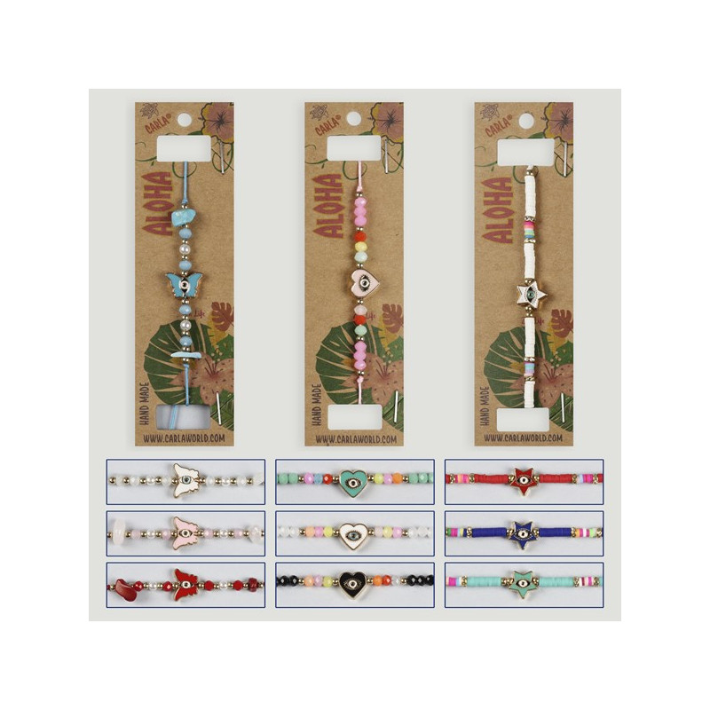 Se envían 192 collares/colgantes, 384 tobilleras y 768 pulseras, en total 1344 piezas montadas en expositor metálico.