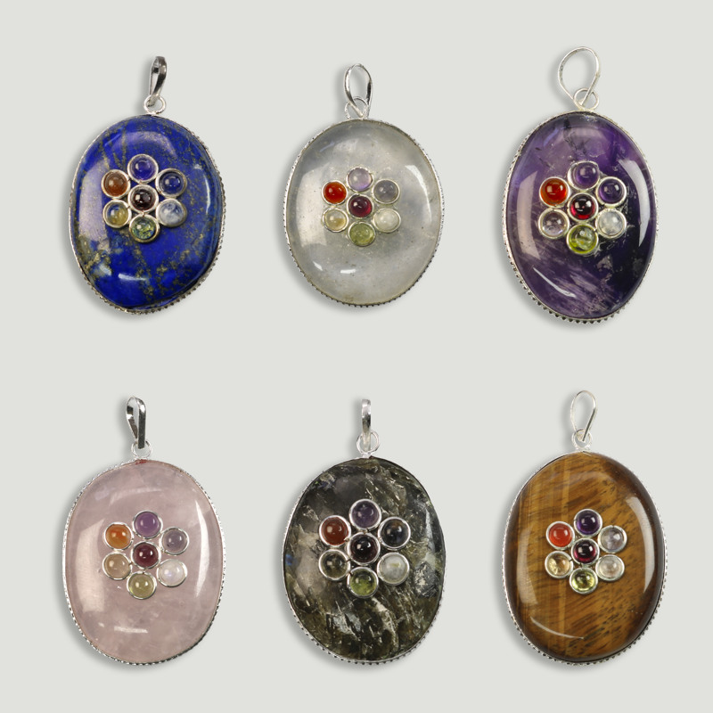 CHAKRA. Colgante SILVER PLATED. Minerales surtidos. 7 cabujones