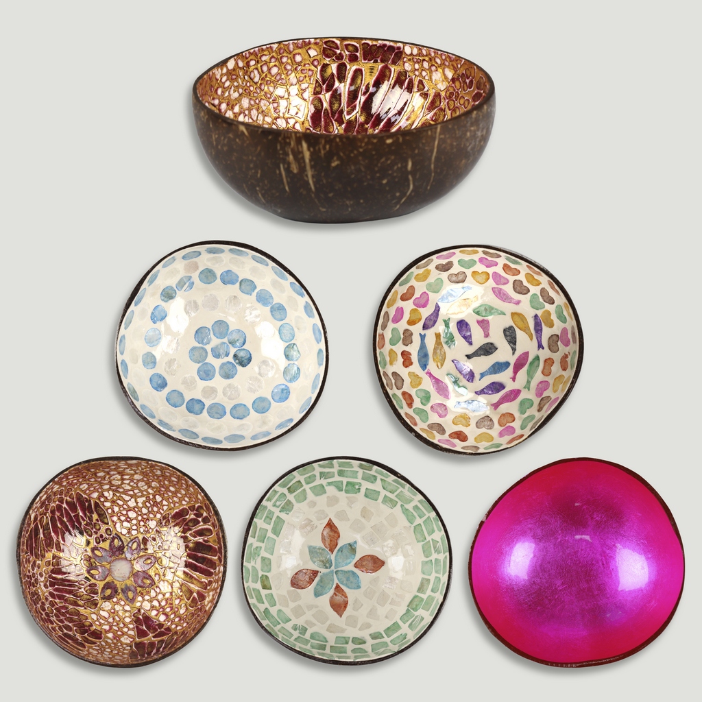 Material: coco en la parte exterior, interior de incrustaciones en nácar.