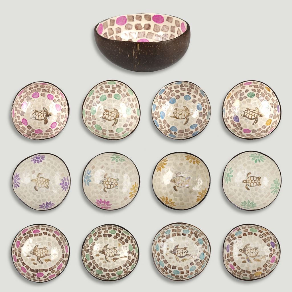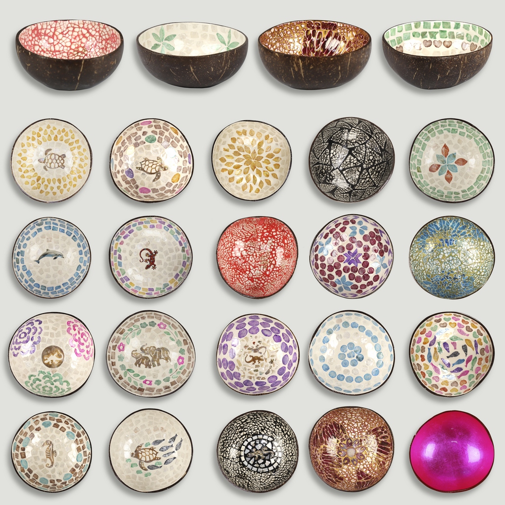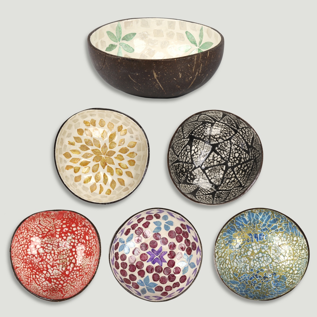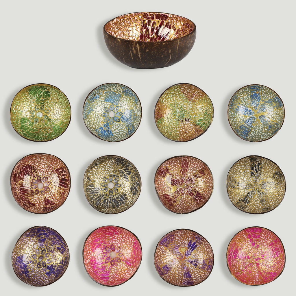 Material: coco en la parte exterior, interior de incrustaciones en nácar.