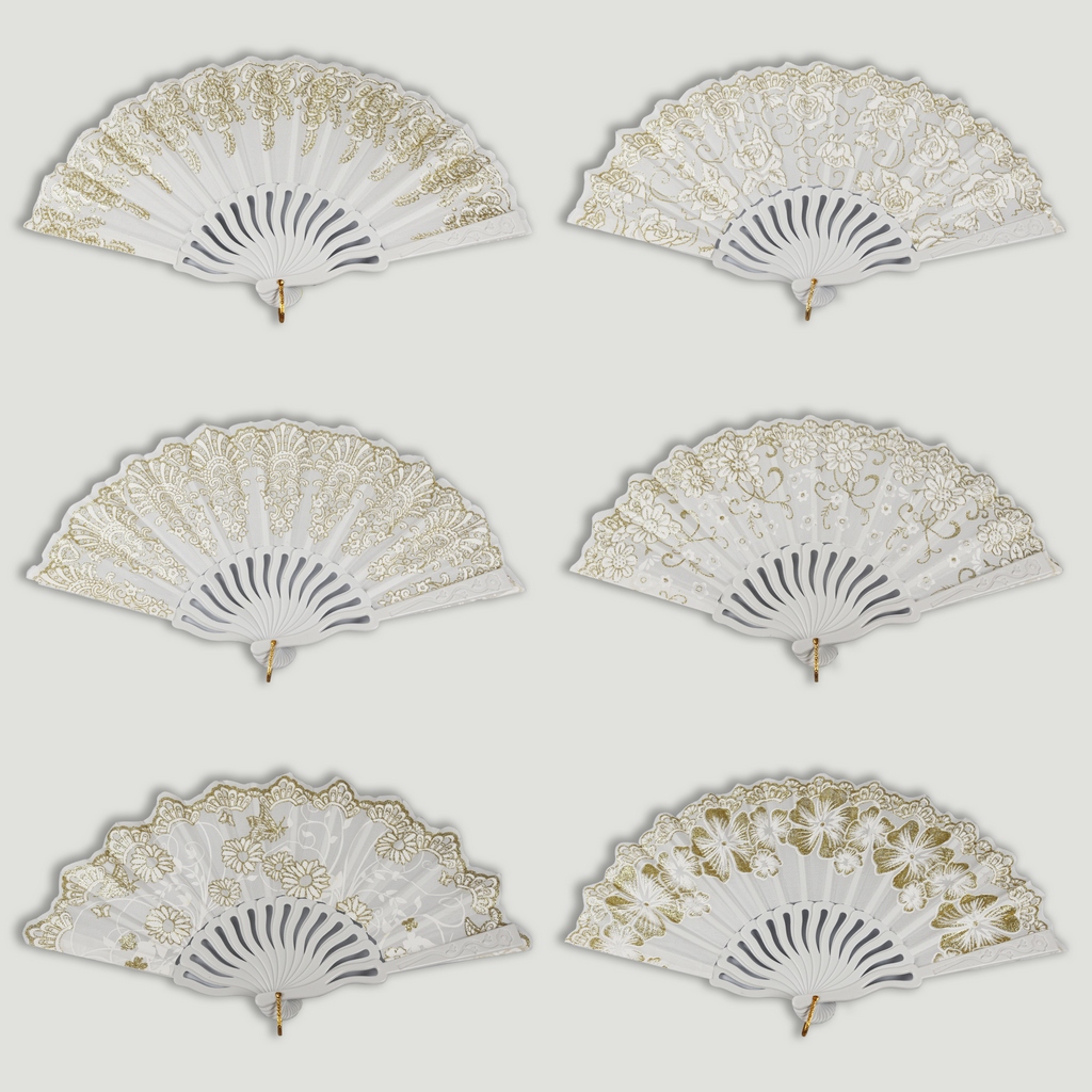 Abanico plástico. 52. Modelo Relieve dorado flores. Surtidos