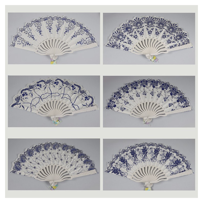 Abanico plástico. Modelo Relieve flores azules. Surtidos