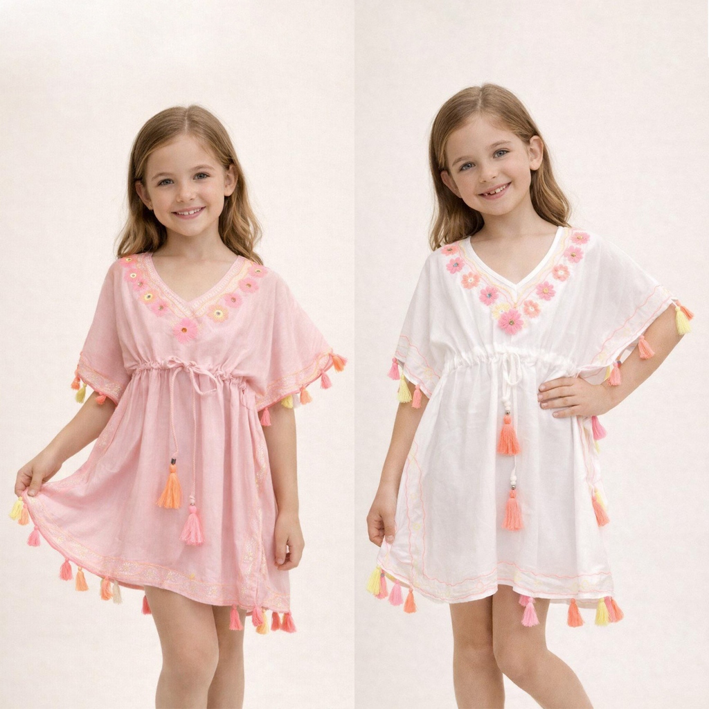 Estilo: Poncho ajustable debajo del pecho. Escote en V. Acabado/adornos con borlas colores fluor. Tela estilo Tie Dye. Manga murciélago.