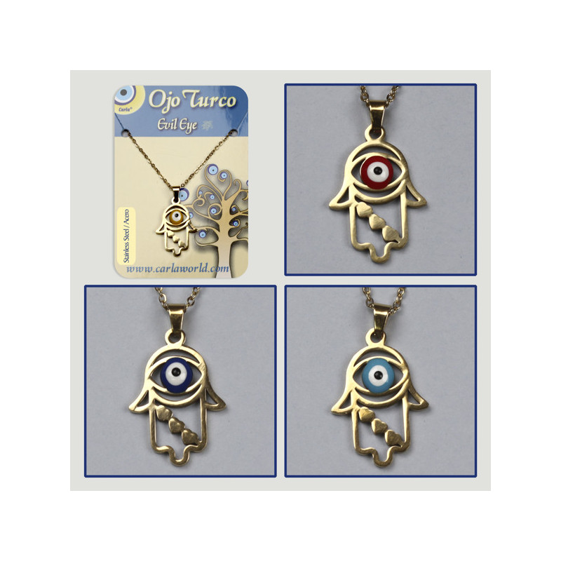 Colgante acero dorado. 23. Ojo Turco. Mano Fátima. Surtidos
