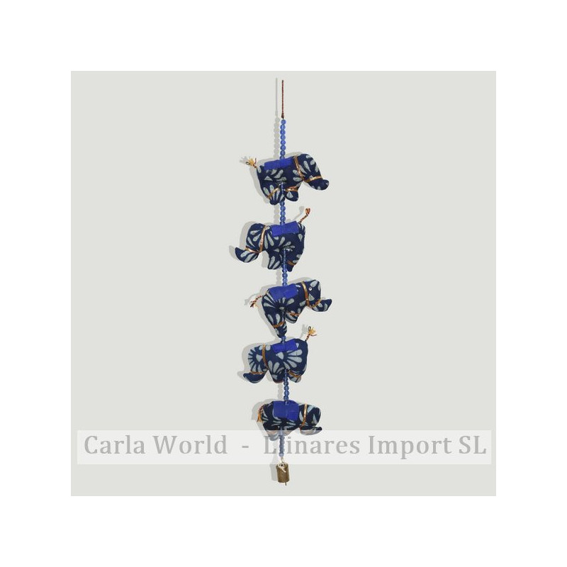 Móvil algodón. 5 elefantes tela azul + bolitas. 65cm