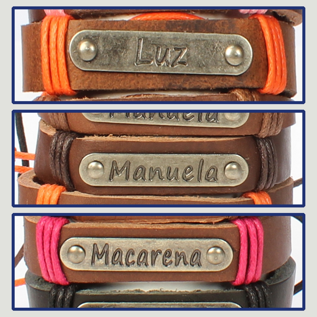 Gancho 39 – Pulsera piel con nombre. Letras L,M: Luz, Manuela y Macarena