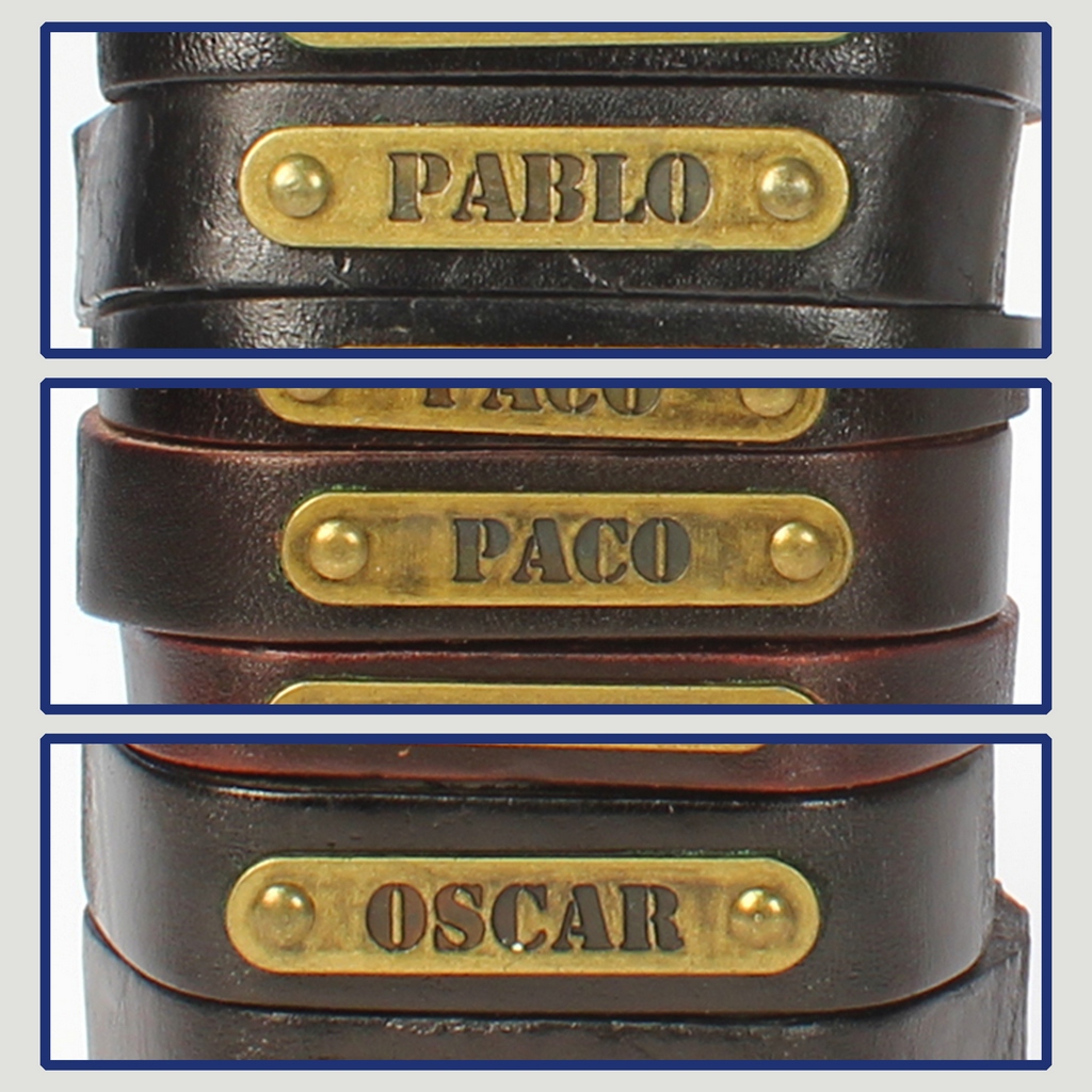 Gancho 44 – Pulsera piel con nombre. Letras O,P: Pablo, Paco y Óscar
