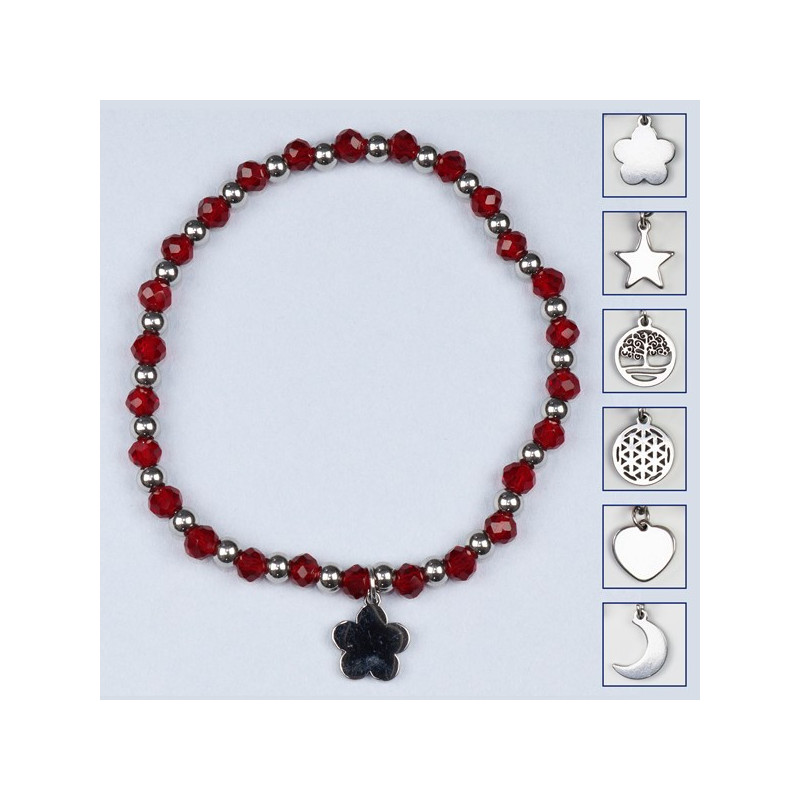 Pulsera cristal. 14. Charm acero Inox. Color Rojo