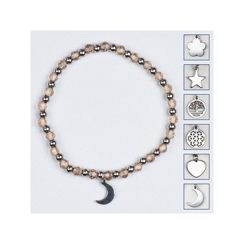 Pulsera cristal. 15. Charm acero Inox. Color Marrón claro