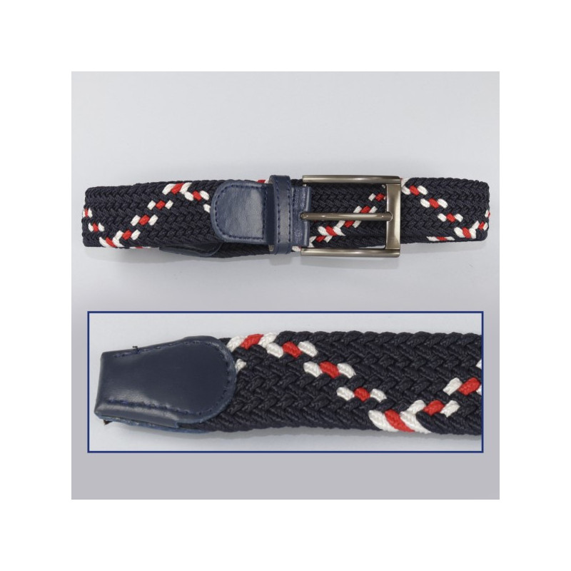 Color: Azul con franja blanca y roja.