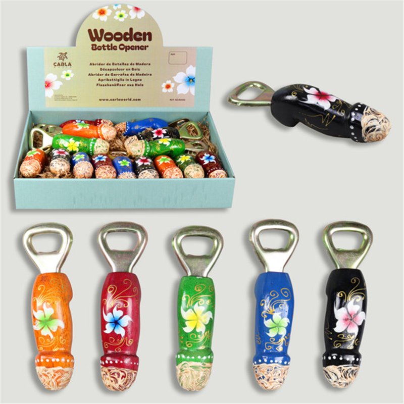 WOODEN SOUVENIR. Ouvre-bouteille en bois. Fleurs colorées