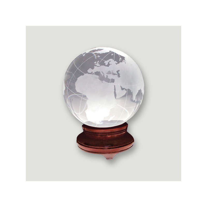 Monde de boule en verre reconstitué avec base en bois. 20 cm