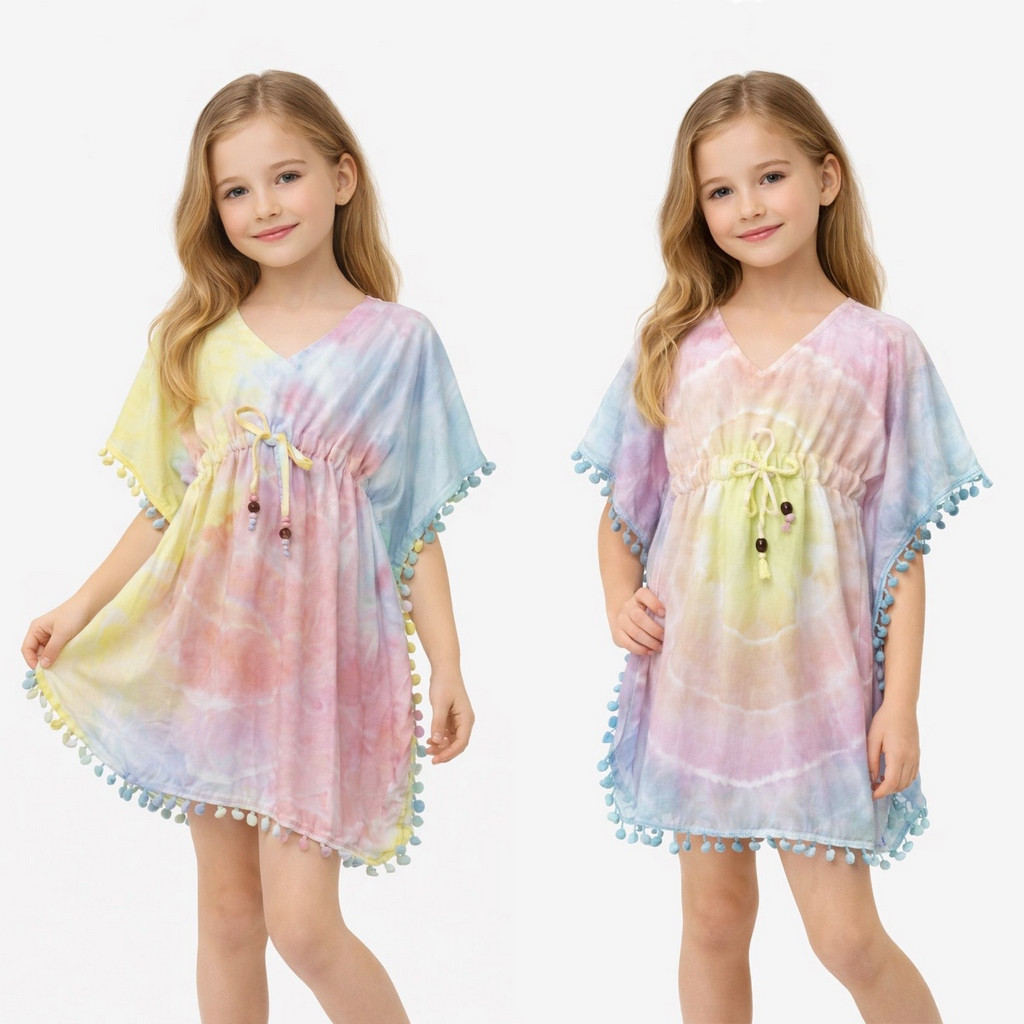 Style : Poncho réglable sous la poitrine. Encolure en V. Garniture/finition pompon boule. Tissu style Tie Dye. Manche chauve-souris.