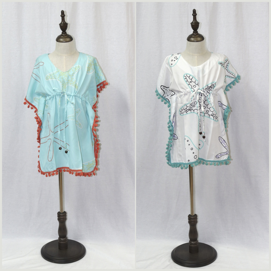 Style : Poncho réglable sous la poitrine. Encolure en V. Garniture/finition pompon boule. Tissu style Tie Dye. Manche chauve-souris.