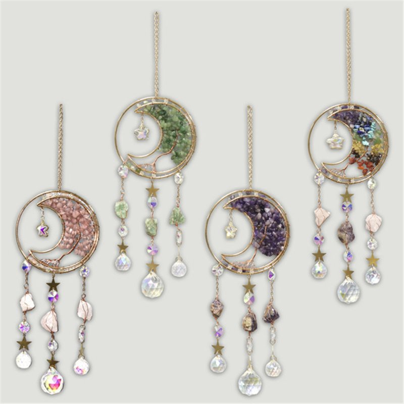 Modèle : Lune avec brut et gouttes. Lune avec brut et gouttesQuartz Rose, Aventurine verte, Améthyste et Chakra.