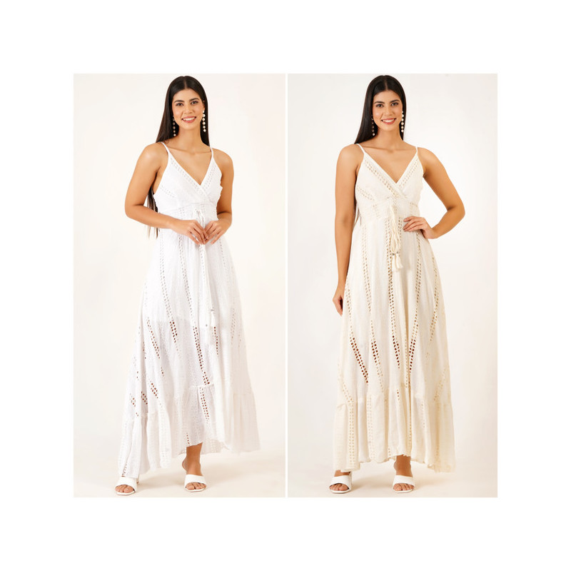 Style : Robe longue à bretelles, dos droit et décolleté en V croisé. Broderies ajourées et florales.