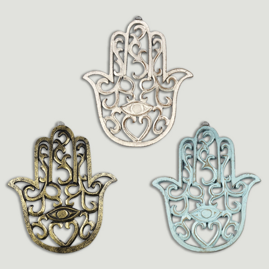 Main de Fatima pour mur en bois 17x20cm coloris assortis