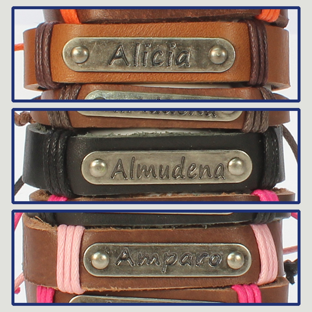 Gancho 03 – Pulsera piel con nombre. Letra A: Alicia, Almudena y Amparo