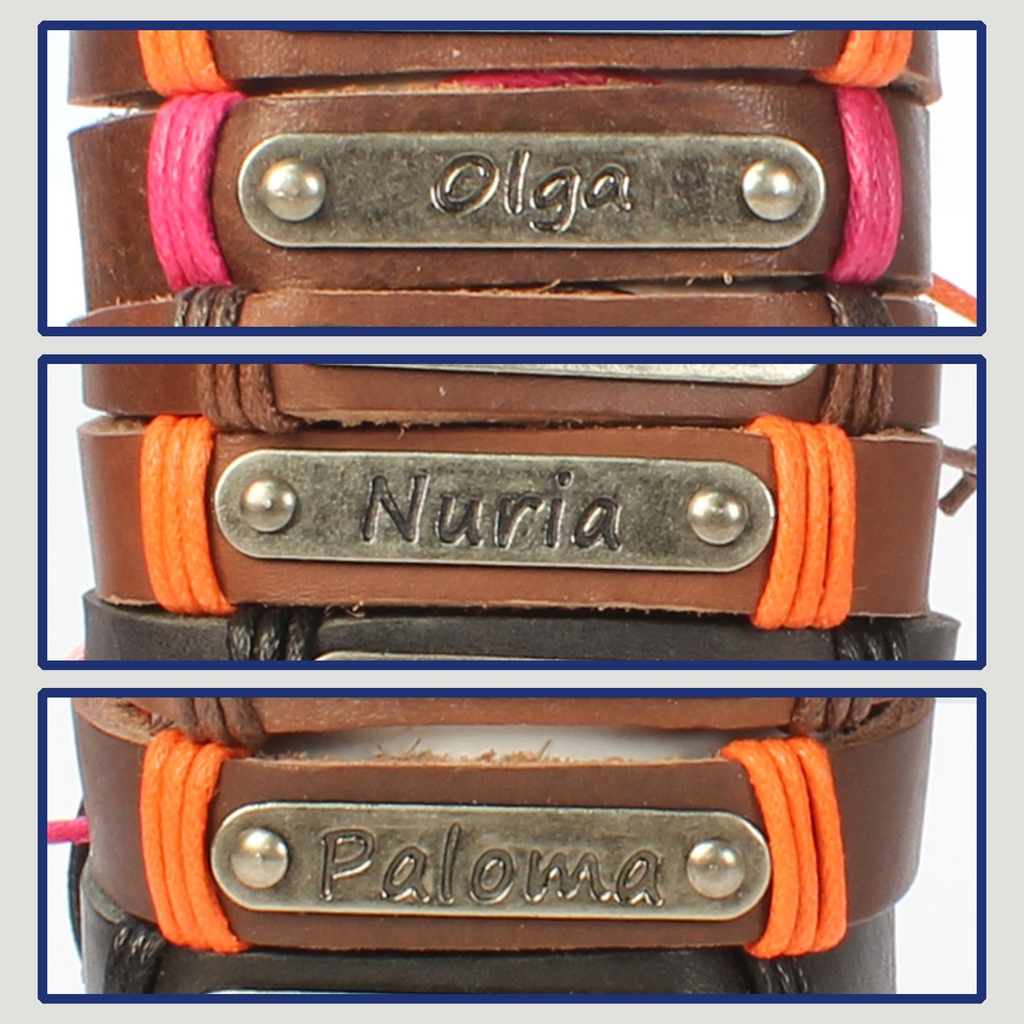 Gancho 49 – Pulsera piel con nombre. Letras N,O,P: Olga, Núria y Paloma