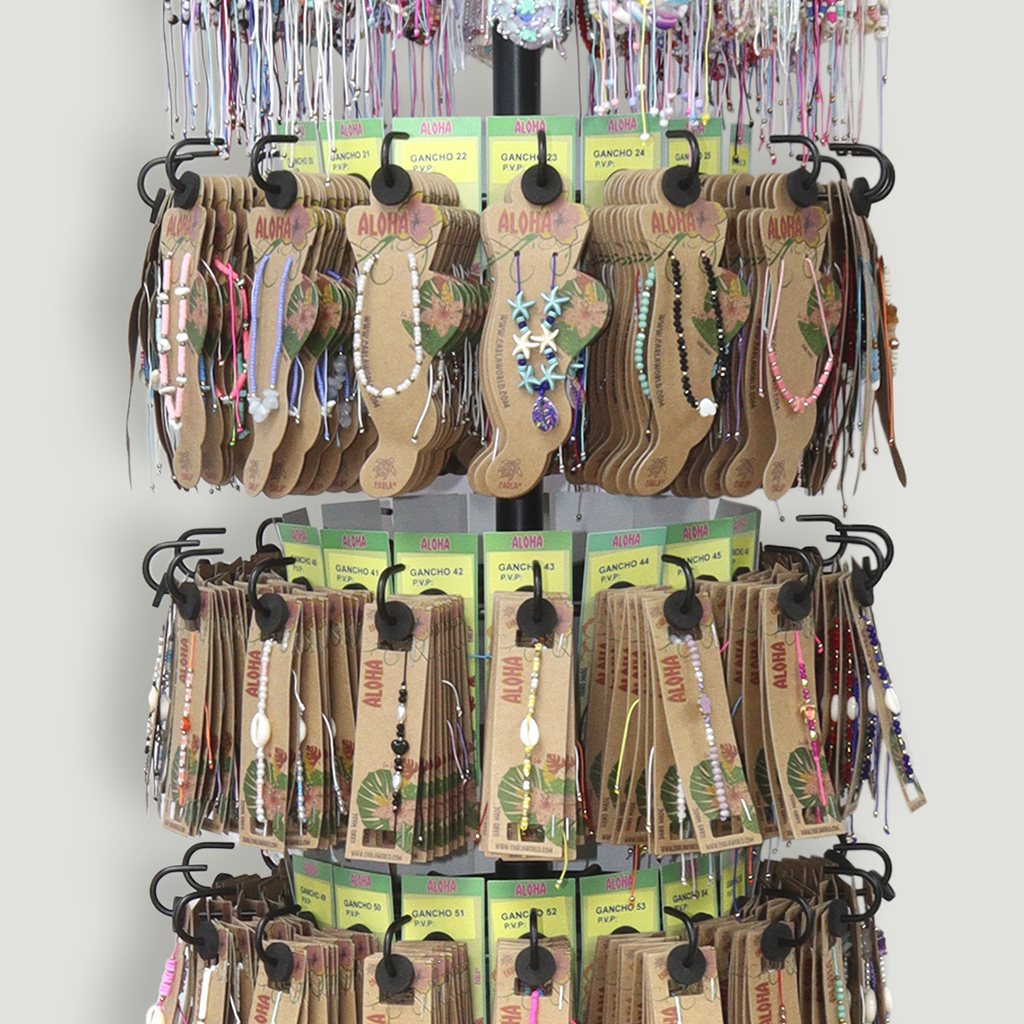 Foram enviados 192 colares/pendentes, 384 tornozeleiras e 768 pulseiras, num total de 1344 peças montadas num expositor metálico.
