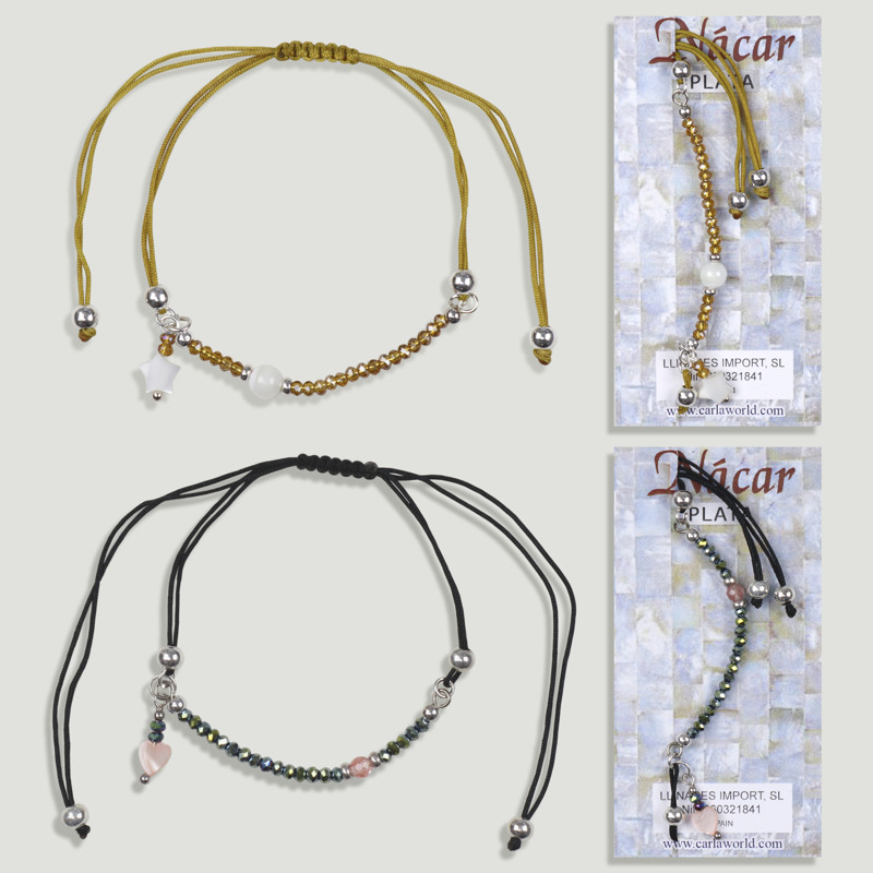 Modelo: Pulseira com contas prateadas e nó deslizante para facilitar o ajuste ao pulso.