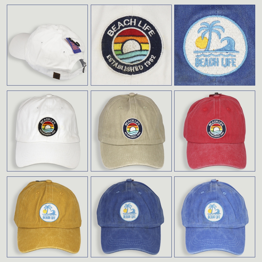 Produto: Boné em cores sortidas. 2 modelos por gancho. Desenho bordado.