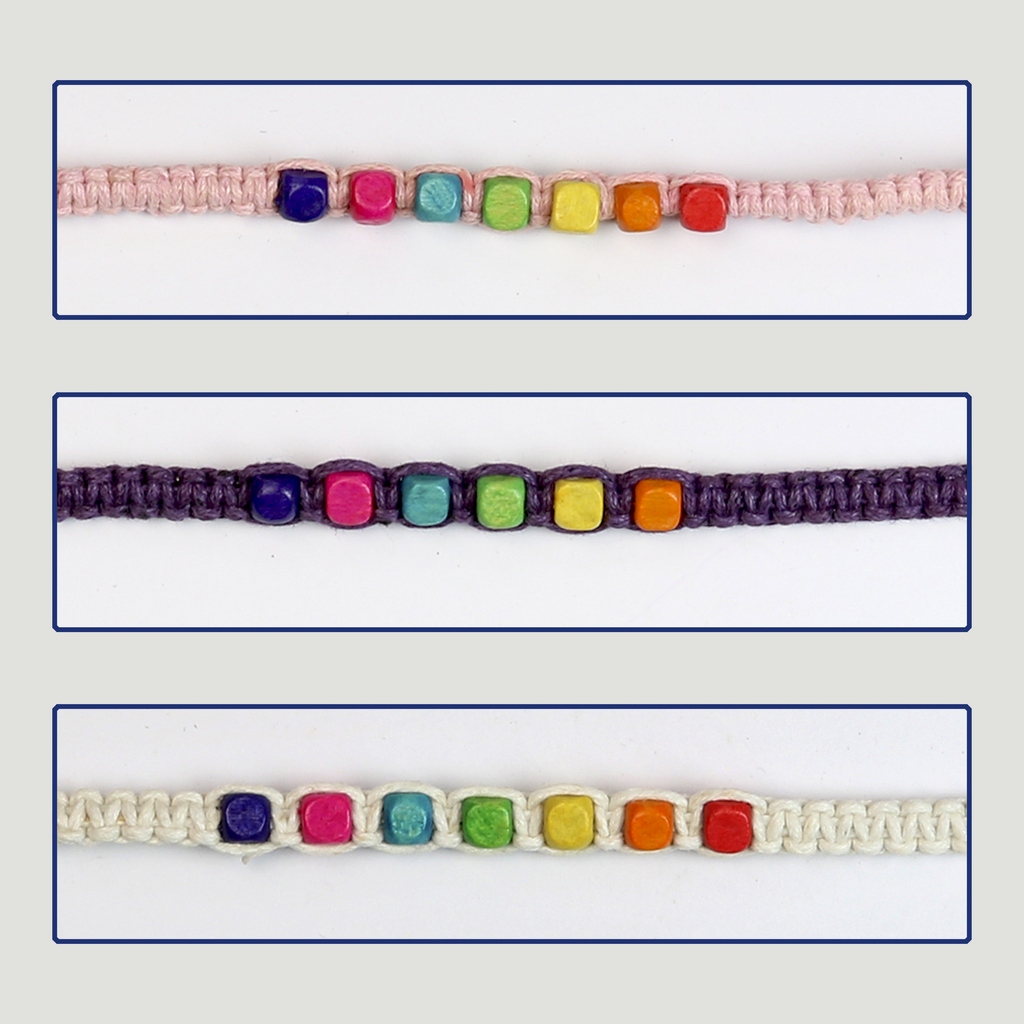 Pulseira de cordão. 93. Cubos madeira. Sortidas