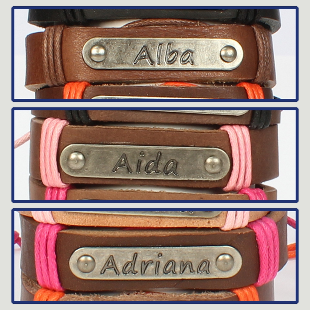 Gancho 01 – Pulsera piel con nombre. Letra A: Alba, Aída y Adriana.